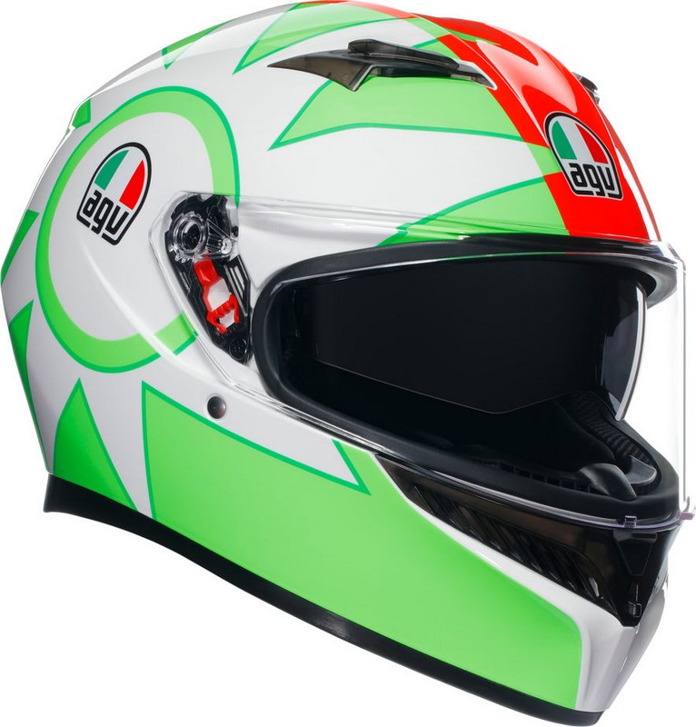 Vielseitigkeit ist seine Stärke. Der K3 ist so konzipiert, dass er in jeder Situation sein Bestes gibt. Die integrierte Sonnenblende, die sich auch mit Handschuhen bequem bedienen lässt, hilft bei übermäßiger Helligkeit und blockiert in Ruheposition nicht die Frontlüftung. Das Pinlock -Beschlagschutzsystem Max Vision garantiert maximale Sicht auch an nassen und kalten Tagen, wenn der Temperaturunterschied zwischen der Umgebung und dem Inneren des Helms ein gefährliches Beschlagen des Visiers verursachen könnte. Nicht beim K3. Das Ultravision Visier bietet außerdem einhorizontales Sichtfeld von 190°, so dass man Hindernisse, die Straße und alles, was vor einem liegt, schneller und besser sehen kann. Der K3 ist für die Integration des speziellen AGV-Intercom-Systems vorgerüstet. Das Eyewear Ready-Innendesign ermöglicht es, während der Fahrt bequem eine Brille oder Sonnenbrille zu tragen.