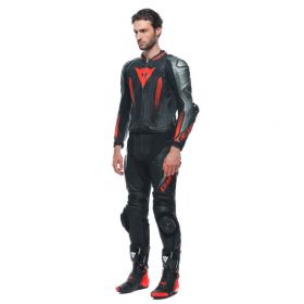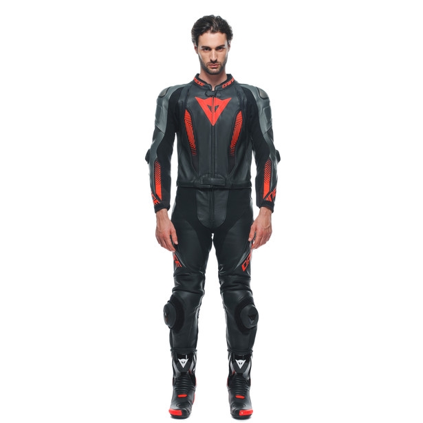 2-piece leather motorcycle suit with Tri-Axial stretch insert on the back and composite protectors on shoulders, elbows and knees. Ergonomic, versatile and protective.