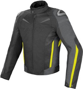 Super Speed Jacke Dainese D-Dry schwarz-grau-gelbes Fluo-Material aus Duratex kombiniert mit Boomerang- und Mesh-Futter mit D-Dry wasserdicht und atmungsaktiv.