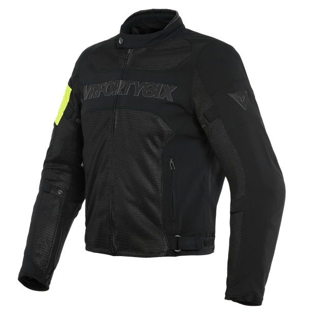 Motorcycle jacket in summer fabric inspired by the style of Valentino Rossi. Versatile due to the removable windproof lining.