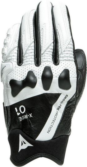 Protective racing technology meets the comfort of a glove designed for everyday use.X-Ride are the Dainese sports-cut leather gloves that use Ergo-Tek knuckle protection technology, created by mapping those areas of MotoGP™ riders' gloves most susceptible to impact. The result is a glove that combines maximum protection, thanks to its nylon-carbon plates, with significant freedom of movement.The little finger, one of the most sensitive and fragile parts in an impact, is protected with a special thermoplastic plate, which limits any damage owing to friction against the asphalt or other surfaces. The integrated DCP system also protects it against any twisting.For maximum comfort regardless of hand movement, large stretch areas are inserted on the back, upper fingers and thumb. The goatskin used to create X-Ride offers excellent abrasion resistance, maximum softness and flexibility.Smart Touch technology inserts on the fingers allow for the use of a smartphone, GPS or other touchscreen system with no need to remove the glove..d-pdp-video {width:100%; height:200px;} @media only screen and (min-width:758px) { .d-pdp-video {height:600px;} }