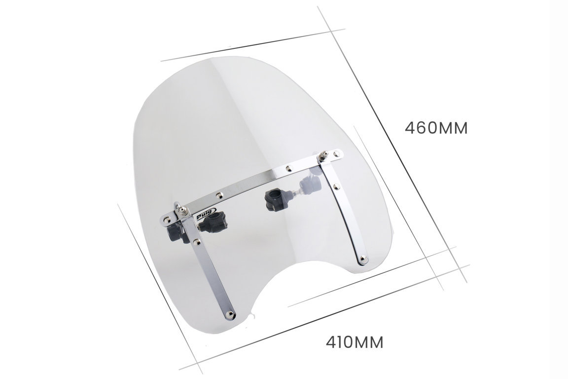 Wenn Sie ein CUSTOM-Motorrad mit rundem Scheinwerfer haben und die Verkleidung erneuern möchten, wird das Modell DAYTONA IV perfekt zu Ihrer Maschine passen. Sie wurde im Rahmen der CUSTOM-Windschutzscheiben-Linie von Puig entwickelt und besteht aus 3 mm starkem, schlagfestem Acryl. Sie ist sehr widerstandsfähig gegen mögliche Stöße und schlechtes Wetter und schützt Sie während der Fahrt vor Kälte und Windböen. Das Teil ist als Universalmodell erhältlich, das auf die meisten Motorradmodelle passt, und wird mit einem kompletten Montagesatz geliefert. Die Installation der DAYTONA IV Windschutzscheibe ist eine einfache und saubere Aufgabe, die mit einer Anleitung geliefert wird, um die Befestigung des Teils an Ihrem Motorrad weiter zu erleichtern. Die Windschutzscheibe wird mit 2 Flanschen an den Lenker montiert. Das Teil wurde vom deutschen TÜV geprüft und enthält das ABE38007-Zertifikat