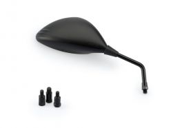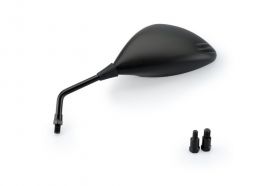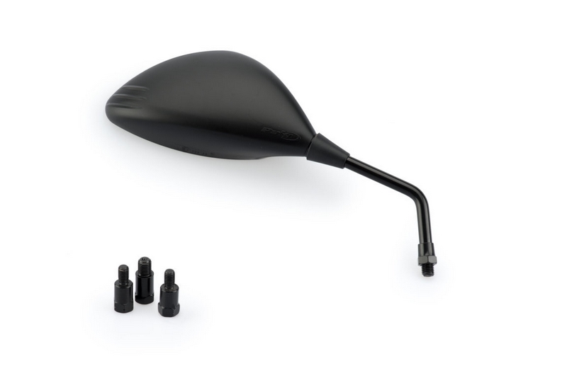 Dieser Spiegel hat ein fließendes Design, das elegante und aerodynamische Formen schafft. Die homologierten Abmessungen des konvexen Spiegels gewährleisten eine gute Sicht, und das endgültige Einstellsystem mit Kugelgelenk ermöglicht die manuelle Einstellung des Spiegels. Die verschiedenen Formate ermöglichen die Montage an den meisten Motorrädern, mit oder ohne Verkleidung. Der Hauptrahmen und der Fuß bestehen aus gespritztem Thermoplast mit mattschwarzer Struktur, die Verbindungsstütze zwischen beiden ist aus Stahl gefertigt.