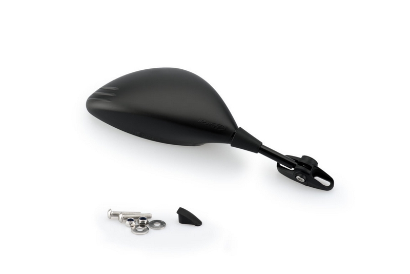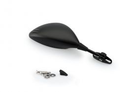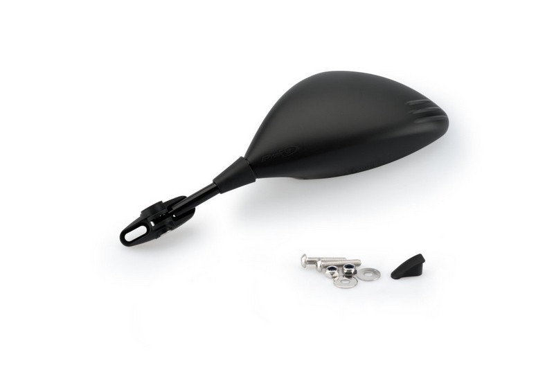Dieser Spiegel hat ein fließendes Design, das elegante und aerodynamische Formen schafft. Die homologierten Abmessungen des konvexen Spiegels gewährleisten eine gute Sicht, und das endgültige Einstellsystem mit Kugelgelenk ermöglicht die manuelle Einstellung des Spiegels. Die verschiedenen Formate ermöglichen die Montage an den meisten Motorrädern, mit oder ohne Verkleidung. Der Hauptrahmen und der Fuß bestehen aus gespritztem Thermoplast mit mattschwarzer Struktur, die Verbindungsstütze zwischen beiden ist aus Stahl gefertigt.