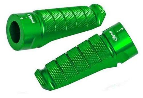 Die Puig-Racing-Fußrasten wurden speziell für R-Motorräder entwickelt und bieten dem Fahrer und Beifahrer maximalen Halt. Ihr attraktives Sportdesign macht sie zur perfekten Ergänzung für die radikalsten Motorräder, deren Ästhetik einen noch extremeren Touch erhält. Sie messen 72 mm in der Länge und 27 mm in der Breite und wiegen nur 90 g. Die Ergonomie ist ein Schlüsselfaktor in ihrem Design, das so konzipiert wurde, dass die freie Höhe zum Boden vergrößert wird, wodurch der Neigungswinkel des Motorrads erhöht werden kann. Sie sind in der Neigung einstellbar und haben Markierungen, die eine größere Präzision bei der Montage zu gewährleisten. Die Rennsport-Fußrasten bieten dem Fahrer ein hohes Maß an Vertrauen, sowohl bei ruhiger Fahrt als auch in den Momenten, in denen der Fahrer versucht, die Grenzen auf der Rennstrecke oder bei Rennen auszuloten, wenn man maximale Sensibilität für alle Komponenten des Motorrads benötigt. Sie werden in den Farben Blau, Schwarz, Gold, Silber, Rot, Orange und Grün hergestellt, so dass jeder Biker die für ihn am besten geeignete Farbe finden kann. F