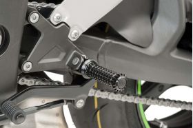 Die R Fighter-Fußrasten wurden für Rennfahrer entwickelt, die maximalen Halt und absolutes Vertrauen in den schwierigsten Situationen beim Fahren ihres Motorrads brauchen. Das Design dieser Komponente ist von den Zähnen eines Zahnrads inspiriert. Es ist eine leichte Konstruktion, da es auf einem eloxierten Aluminiumblock gefräst ist, der auch eine bessere Oberfläche und ein hochwertigeres Finish bietet. Die gesamte Kontur der R Fighter-Fußrasten bietet dem Fahrer einen optimalen Halt, unabhängig von der Position des Stiefels, was zu größtmöglicher Sicherheit in jeder Situation führt, unabhängig von der Art des Fahrens, die zu jeder Zeit durchgeführt wird, sei es auf einer touristischen Strecke, allein oder mit einem Begleiter, oder auf der Suche nach Grenzen auf einer Rennstrecke bei Trackdays. Die Palette der Fußrasten R Fighter besteht aus dem Modell R aus Metall und dem Modell S, das mit einem Gummigehäuse ausgestattet ist, das die Motorvibrationen eliminiert und dem Fahrer mehr Komfort beim Fahren bietet