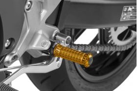 Die R Fighter-Fußrasten wurden für Rennfahrer entwickelt, die maximalen Halt und absolutes Vertrauen in den schwierigsten Situationen beim Fahren ihres Motorrads brauchen. Das Design dieser Komponente ist von den Zähnen eines Zahnrads inspiriert. Es ist eine leichte Konstruktion, da es auf einem eloxierten Aluminiumblock gefräst ist, der auch eine bessere Oberfläche und ein hochwertigeres Finish bietet. Die gesamte Kontur der R Fighter-Fußrasten bietet dem Fahrer einen optimalen Halt, unabhängig von der Position des Stiefels, was zu größtmöglicher Sicherheit in jeder Situation führt, unabhängig von der Art des Fahrens, die zu jeder Zeit durchgeführt wird, sei es auf einer touristischen Strecke, allein oder mit einem Begleiter, oder auf der Suche nach Grenzen auf einer Rennstrecke bei Trackdays. Die Palette der Fußrasten R Fighter besteht aus dem Modell R aus Metall und dem Modell S, das mit einem Gummigehäuse ausgestattet ist, das die Motorvibrationen eliminiert und dem Fahrer mehr Komfort beim Fahren bietet