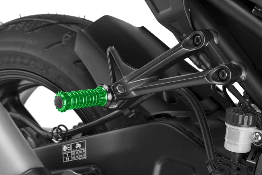 Die R Fighter-Fußrasten wurden für Rennfahrer entwickelt, die maximalen Halt und absolutes Vertrauen in den schwierigsten Situationen beim Fahren ihres Motorrads brauchen. Das Design dieser Komponente ist von den Zähnen eines Zahnrads inspiriert. Es ist eine leichte Konstruktion, da es auf einem eloxierten Aluminiumblock gefräst ist, der auch eine bessere Oberfläche und ein hochwertigeres Finish bietet. Die gesamte Kontur der R Fighter-Fußrasten bietet dem Fahrer einen optimalen Halt, unabhängig von der Position des Stiefels, was zu größtmöglicher Sicherheit in jeder Situation führt, unabhängig von der Art des Fahrens, die zu jeder Zeit durchgeführt wird, sei es auf einer touristischen Strecke, allein oder mit einem Begleiter, oder auf der Suche nach Grenzen auf einer Rennstrecke bei Trackdays. Die Palette der Fußrasten R Fighter besteht aus dem Modell R aus Metall und dem Modell S, das mit einem Gummigehäuse ausgestattet ist, das die Motorvibrationen eliminiert und dem Fahrer mehr Komfort beim Fahren bietet